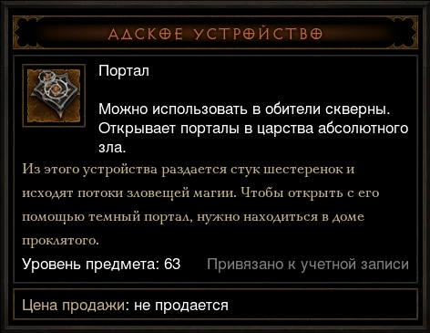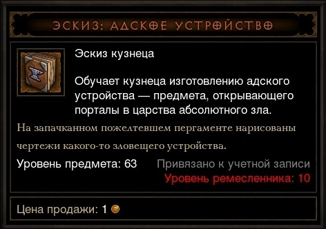 После активации адское устройство разрушится, так что для создания нового портала потребуется изготовить еще одно устройство. Вам снова нужно будет добыть три ключа и заплатить 12 000 золотых кузнецу. Зато об эскизе можете не беспокоиться: кузнец изучил его, и теперь он постоянно будет отображаться в списке предметов, доступных для изготовления.